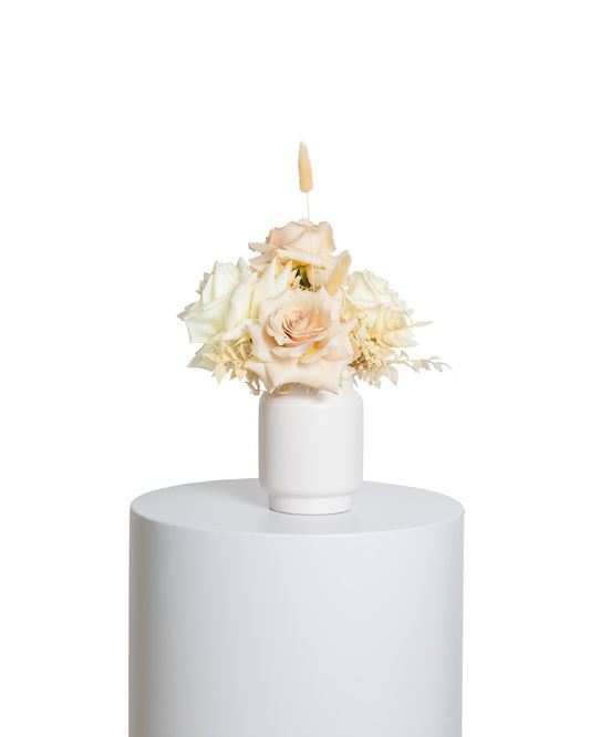 Natural y orgánica. Mezcla de flores naturales y preservadas en tonos neutros y rosa viejo con aire artesanal.