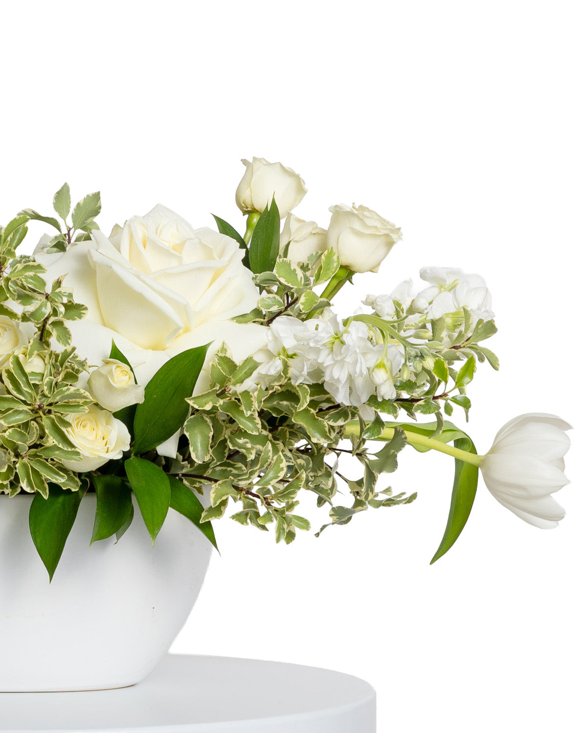 Roses, stocks, tulips, and various foliage.
