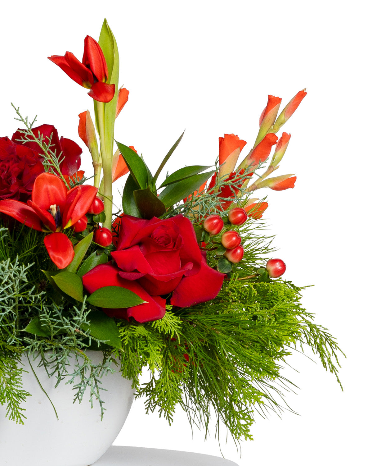 Roses, gladiolas, tulips, St. John's wort and pines.