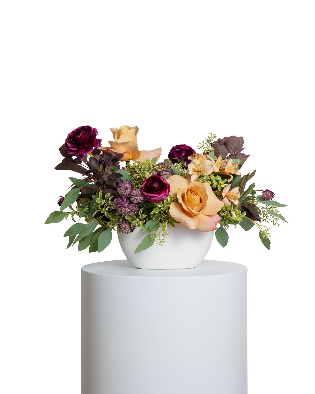 Roses, ranunculus, astrantia, astromelia and various foliage.