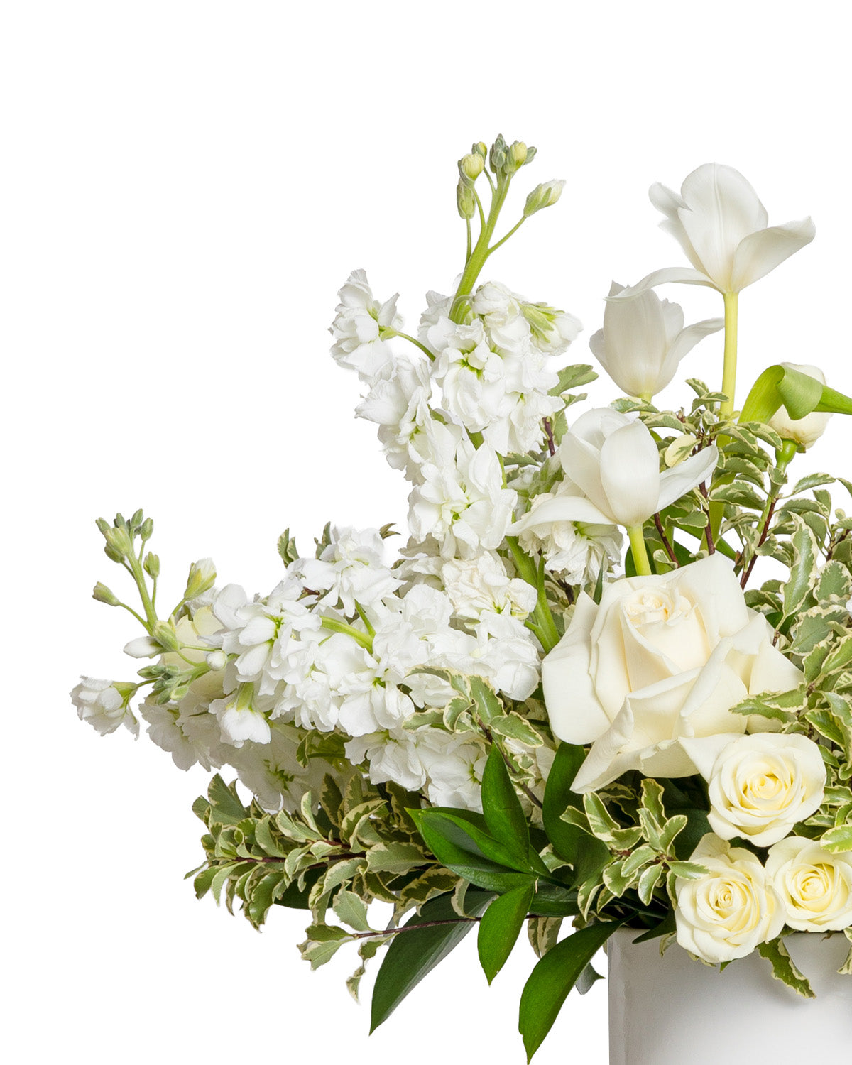 Roses, stocks, tulips, and various foliage.
