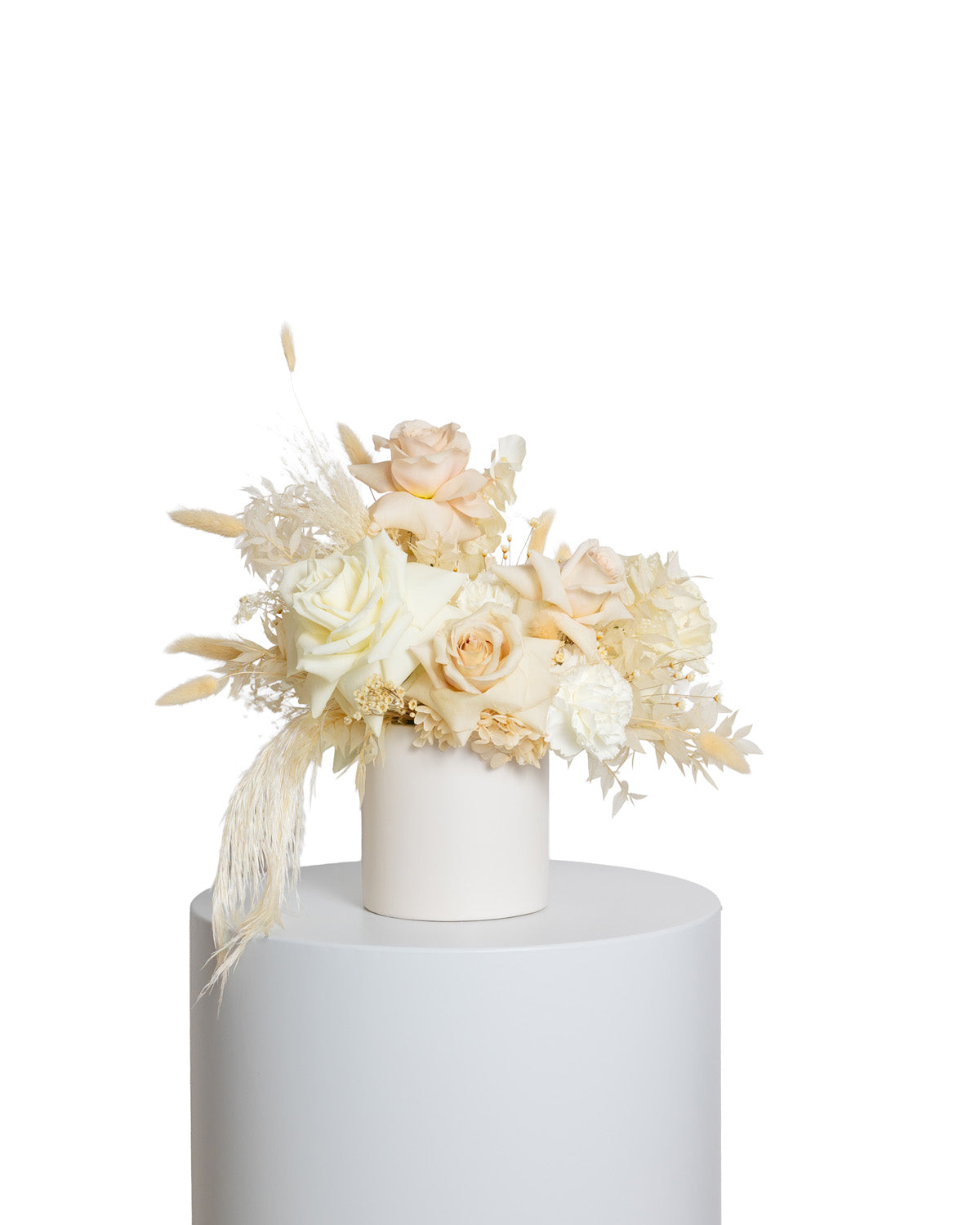 • Natural and preserved flowers and foliage in white, beige and antique rose.