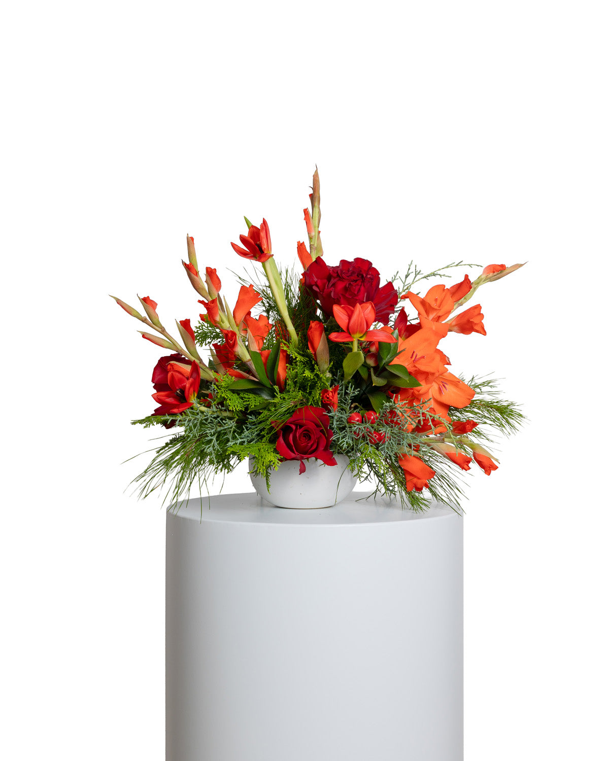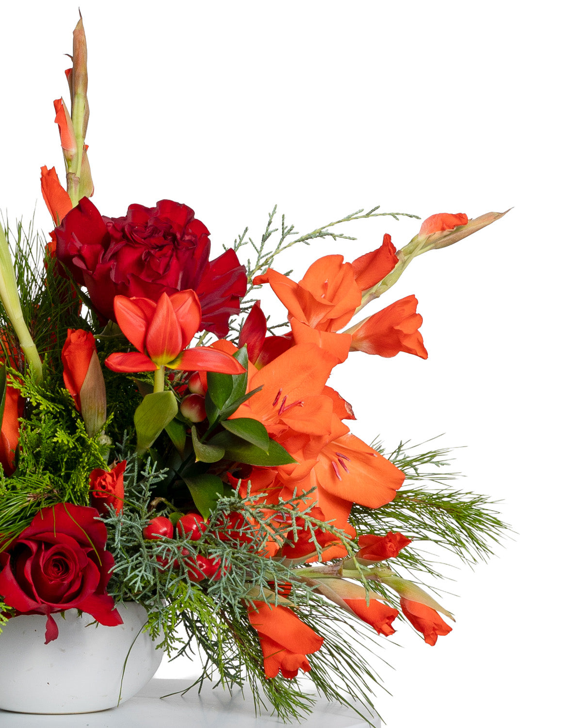 Roses, gladiolus, tulips, hypericum berries, and pine.