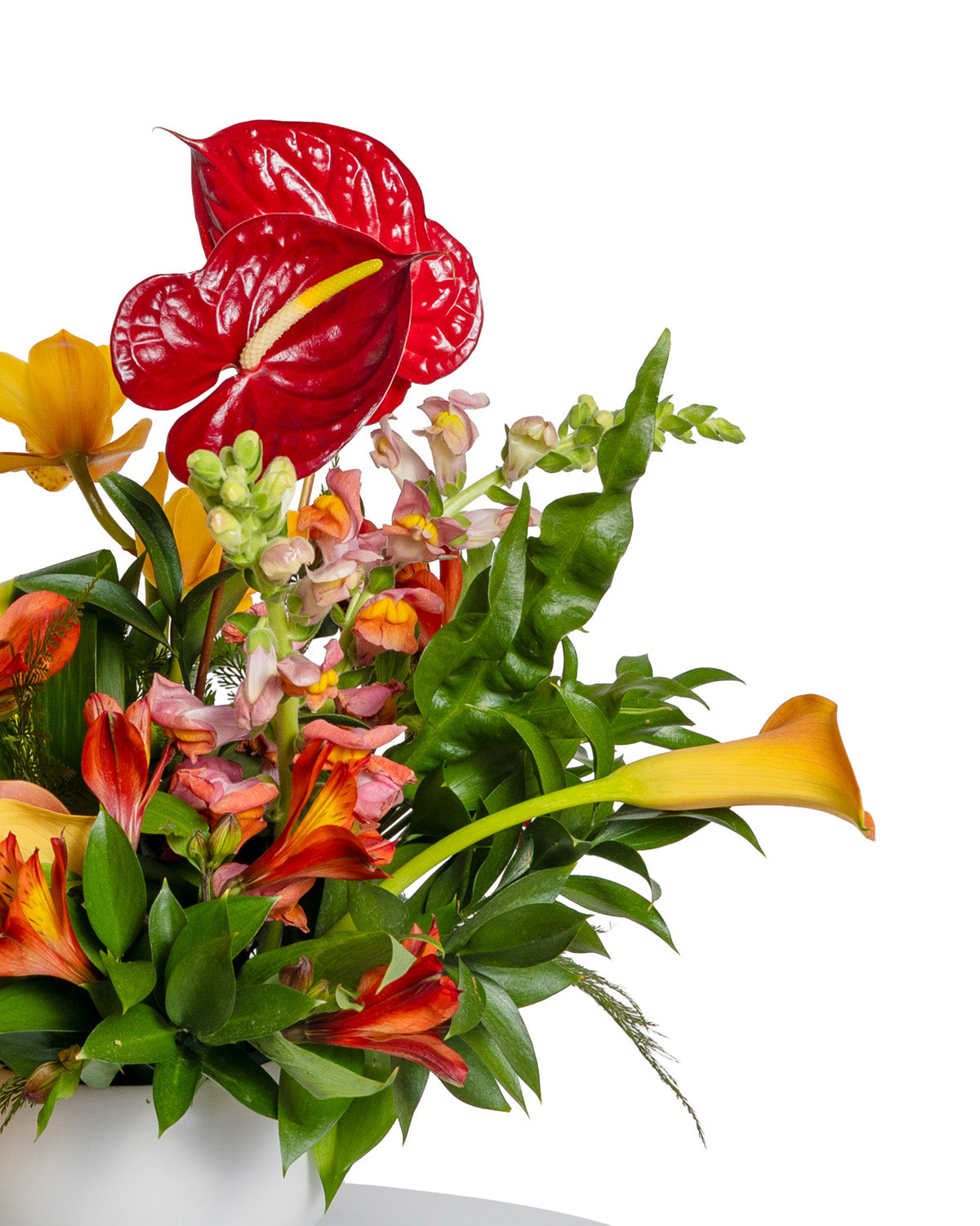 Anthuriums, mini cymbidiums, alstroemerias, snapdragons, mini calla lilies and various foliage.