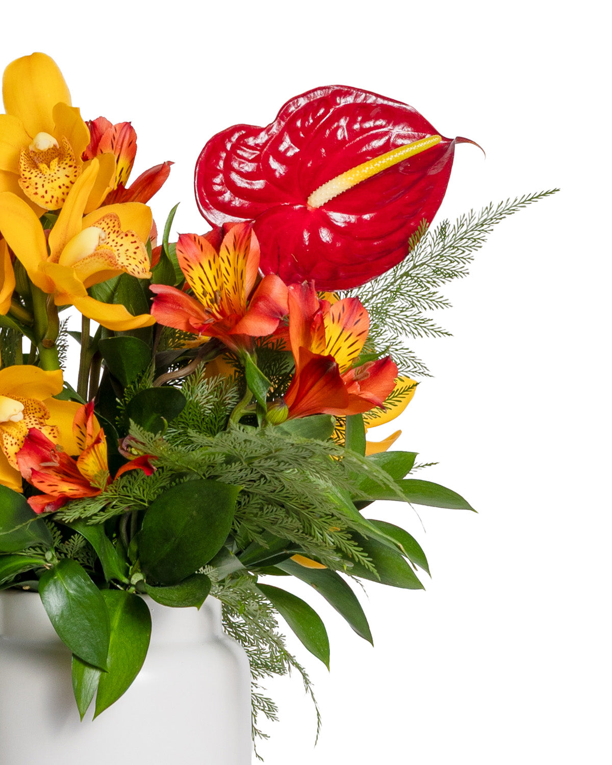 • Natural tropical flowers and foliage in yellow, orange, red and green colors.