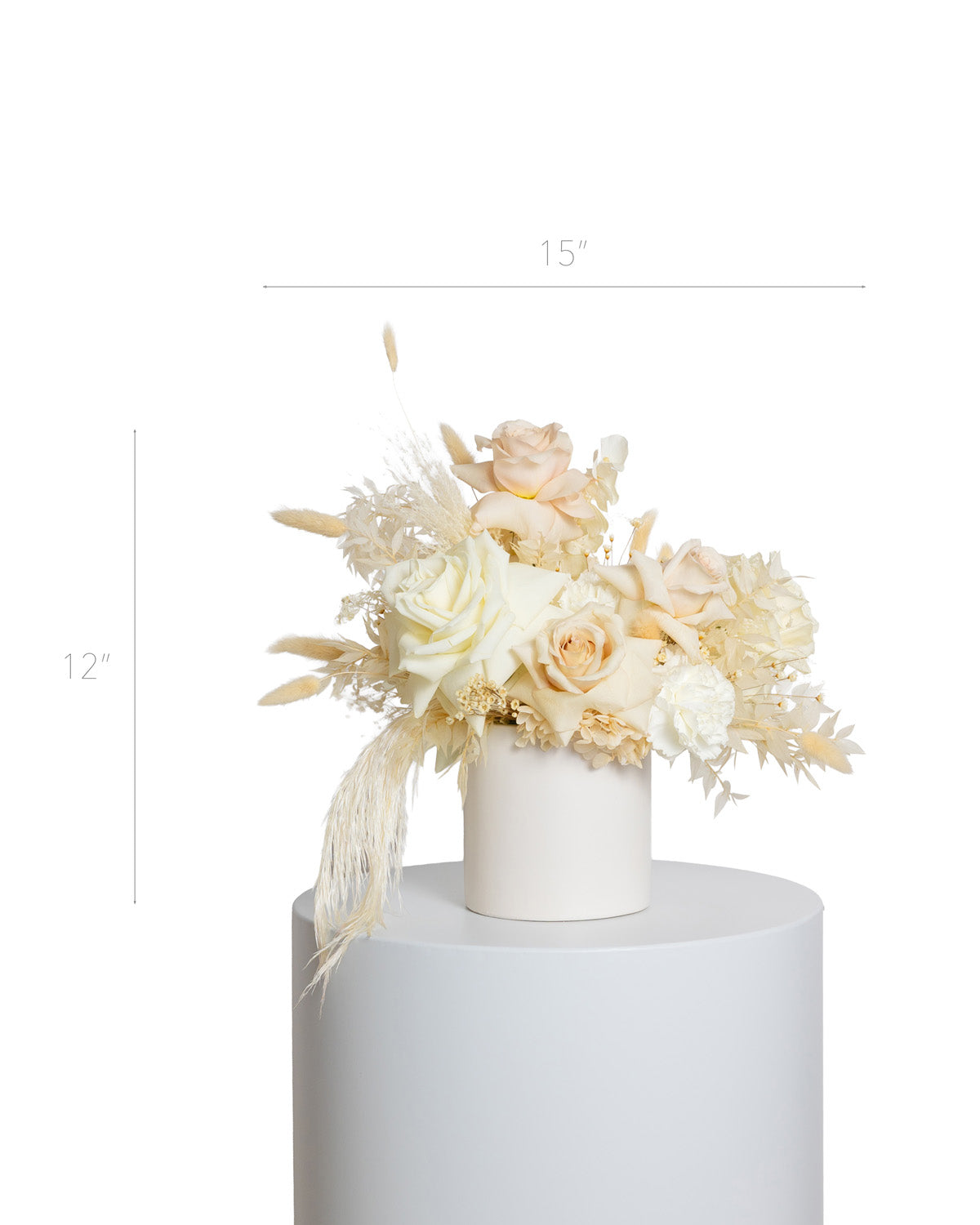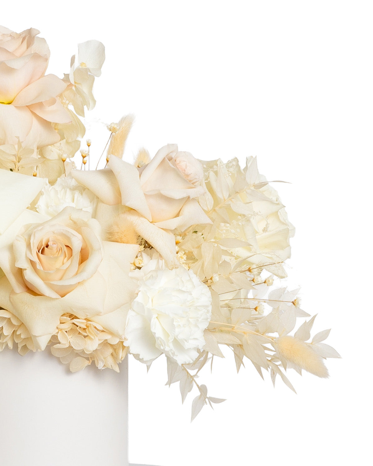 • Flores y follajes naturales y preservados en colores blanco, beige y rosa viejo.