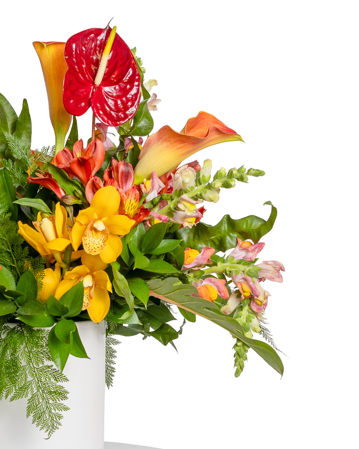 Anturios, mini cymbidium, astromelias, boquitas de dragón, mini calas y follajes variados.