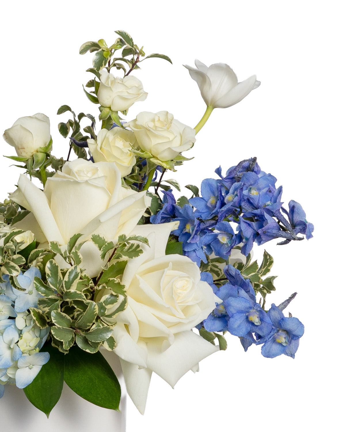 Rosas, delfinio, hortensias, tulipanes y follajes variados.