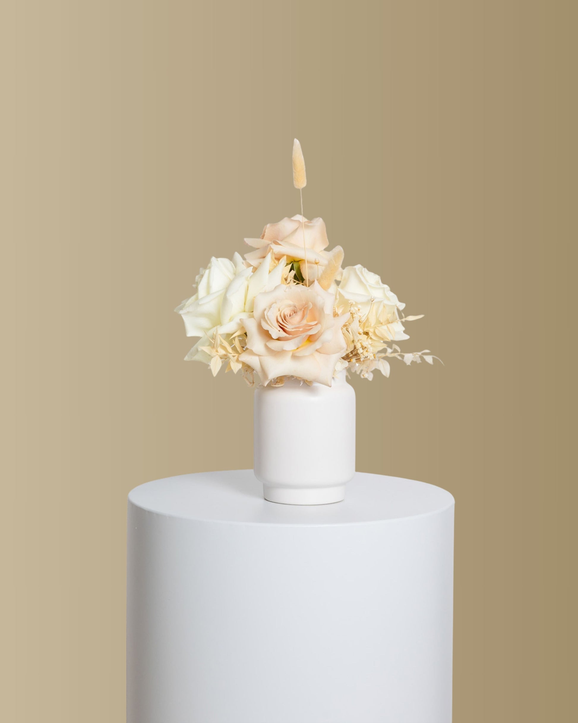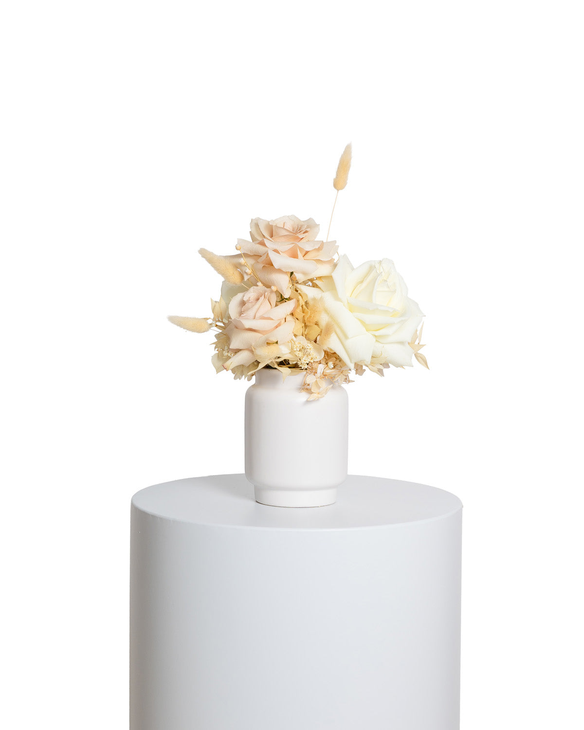 • Flores y follajes naturales y preservados en colores blanco, beige y rosa viejo.